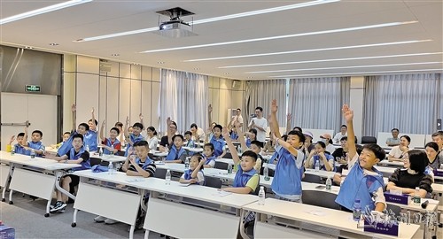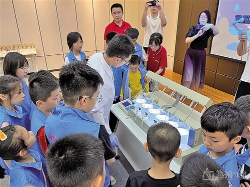 现场参观结束后,为了能更透彻地解释自来水生产的原理,工作人员带领他们来到实验小课堂,通过进行模拟混凝实验,以更直观的方式向小记者们展示了自来水制水的基本流程,加深了小记者们对自来水生产的认识。“小记者们,谁能列举一下节约用水的例子呀?举手回答问题可以赢取粤海水务IP‘海宝’盲盒哦!”“我知道!洗手时随时关闭水龙头。”“将洗菜的水收集起来浇花、冲马桶。”……在随后的趣味问答环节,大家踊跃举手发言,争先恐后地分享日常生活中的节水小妙招,现场氛围热烈。在一声声互动中,小记者们不仅收获了小礼品,也收获了更多的自信快乐和水资源知识。
