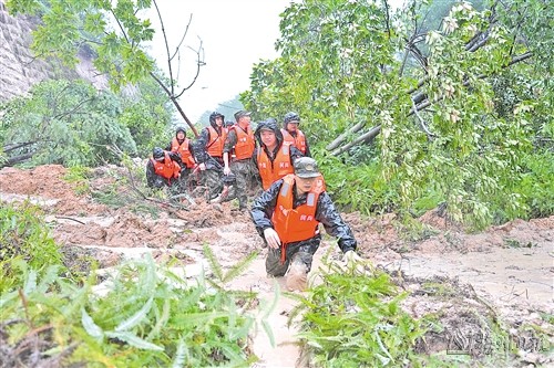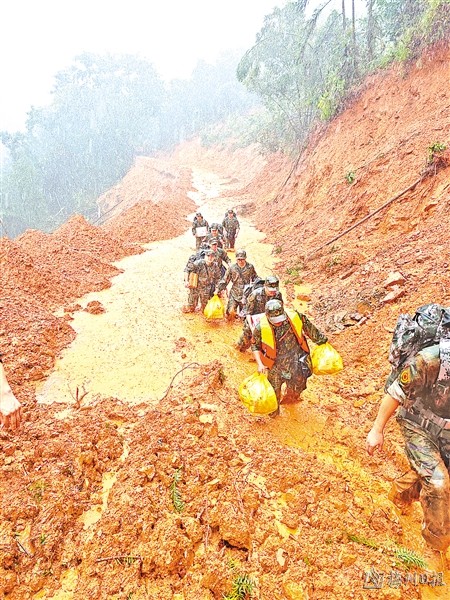 他们克服山体滑坡阻塞、道路积水、路基垮塌等不利因素,踏泥泞、越山路,赶赴救援现场。面对湍急水流、受损道路,他们借助绳索渡过;面对至少齐腰深的洪水与齐膝深的泥泞,他们想到的只有前进,昼夜不停,连续作战,以肩为梯、以背为桥,让被困群众登上救援舟艇,一次又一次蹚水蹚泥而行,背起群众向安全地带转移;不间断挖土、装袋、转运、筑堤,加固堤坝;协助清理和打通各村道路,尽快恢复人员及车辆正常通行……