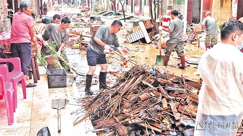 17日下午,平远县人武部组织民兵在执行完应急救援任务后,立即调动200余名民兵组成突击队,赶赴受灾较重的大柘镇坝头村,就地转入灾后重建。到达坝头村时,只见一片狼藉,满地泥泞。见此,民兵们动作迅速、相互配合,多向、多点对断枝杂物、沉积淤泥进行清理。铁锹、耙锄、扫帚等工具干不动的时候,纷纷上手清淤。“能多清一点是一点,能帮助群众,让老街道渐渐恢复原貌,心里很是高兴!”民兵谢坚是一名退伍军人,这次主动请缨参加清淤行动。由于清淤的过程中有泥水冲入雨鞋,加上地面仍有不少“深潭”,谢坚的双脚被泡得发白。即便这样,他也没有停下救援步伐,在简单休憩后,立马投入清淤。