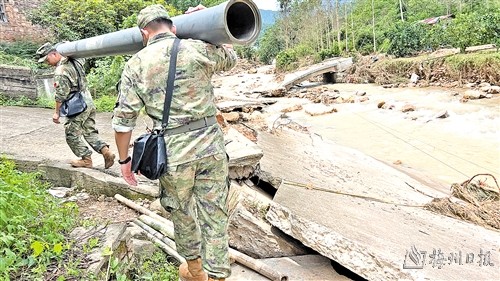 平远县民兵应急连连长李裕斌第一时间集结民兵队伍后,克服前方道路塌方、信号中断等多重困难,冒雨带领救灾分队徒步行军5公里,边前进,边疏通道路,边救援有需要群众;在挺进蕉岭县南磜镇时,由于部分村的道路尚未打通,专武干部们采取背运等方式,冒雨徒步前往该镇洋山、尚田等地运送物资;平远泗水大新村引来泉水保障群众生活用水,因村里常住的大都是老人,民兵突击队队员们特地前来帮助村民提水……“险情面前,时间就是生命,来不得半点拖延。” 当谈及这些天的经历,大埔县民兵何吉明说,虽然累,但是能坚持,穿上迷彩就要有个样子。