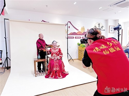 本报讯 (记者张莹娜)日前,梅江区三角镇利园社区开展老年夫妻拍摄结婚照活动,为辖区19对老年夫妻免费拍摄,送上关爱和祝福。