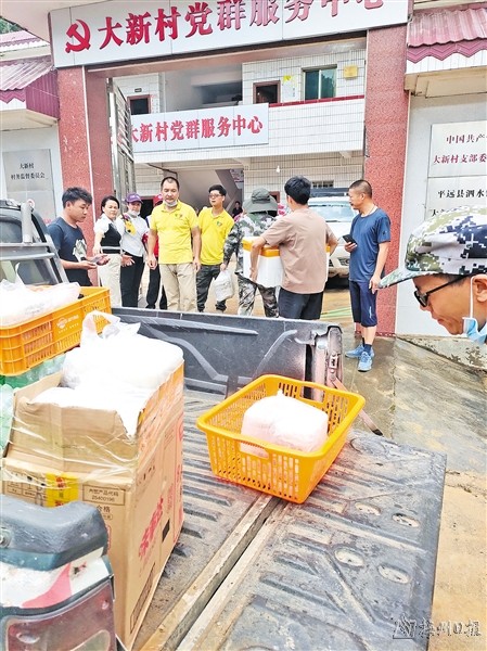 泗水镇大新村村委地势稍高,当地的受灾村民都暂时安置在这里。黄惠说,每当送饭到这里,看到村民吃上自己亲手做的饭菜,心里感到特别满足。
