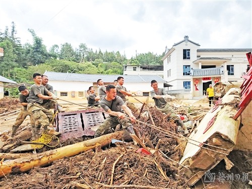 经过洪水肆虐,泗水镇满目疮痍,街道上满是淤泥和杂物,村民家里充斥着淤泥和垃圾,有的院落和房屋剩下的残垣断壁岌岌可危。救援官兵顾不上休息,挨家挨户清淤除险。他们用锹挖、用手刨、用肩扛,快速开展房屋清淤排危、道路清障抢通等工作。