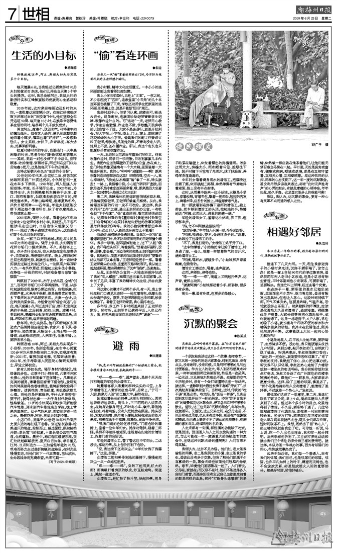 她一眼就看到在房檐下避雨的清洁工,跑上前去,把伞移到清洁工的头顶,拉起她的手,热情地说:“阿姨,这雨太大,进我的家避一避。”