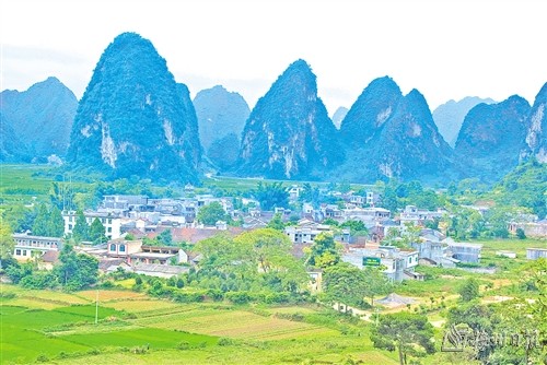 街道一横二竖,竖街尽头是青山,横街背后是鹅泉河,绿水映着青山,古楼印着壮乡民族风情。