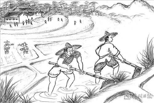 斫削禾柴晒干燥,杉毛杂木并松毛。 田中芋子爱上土,火土培大芋荷苗。 点评:天气晴热,门前的木柴要破开晒干,杉毛、松毛、杂木都要收拾干净。田里的芋苗要培土施肥,而草木灰是最好的肥料,只有芋荷苗长大了,芋卵才结籽多,颗粒大。 |
