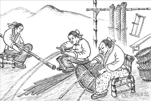六月小暑早禾黄,尝新禾饭荐馨香。 请人补箩买谷笪,又爱破篾箍桶枋。 点评:农历六月,小暑节气,早莳的禾苗变黄,即将到了收获的季节。此时,农家要吃新禾饭,俗称“吃新”,还要烧香拜天地,禀告上苍。接下来可是夏收夏种的大忙季节,农家又得准备好收成工具,请篾匠师傅修补家里的箩筐、谷笪,有的还要把破损的桶枋再用竹篾或铁圈箍紧,以免脱落。“ |
