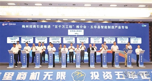本报讯 日前,“赋能升级·智造未来”梅州招商引资推进“百千万工程”推介会·五华县智能制造产业专场活动在广州番禺举行。活动现场共签约项目10个,计划投资总额30.1亿元。省商务厅二级巡视员黄欣,市政协副主席朱国城,五华县委书记钟秀堂,五华县委副书记、县长丘炀等参加活动。