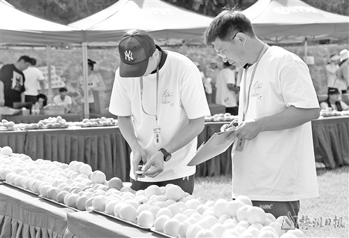6月28日,工作人员在2024年大华山镇“甜桃王”擂台赛现场检测参赛鲜桃的含糖量。