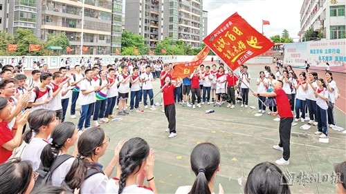 下午2时,东山学校考点内气氛热烈,老师们的祝福声和考生们的加油声此起彼伏、响彻校园。东山学校初三(21)班考生在班主任吴远涛的组织下,排成圆圈,共同喊出班级口号。吴远涛举起满载着班级师生签名和期盼的百日誓师旗帜,逐个与考生们击掌。