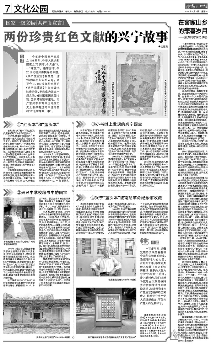 今年是中国共产党成立103周年、中华人民共和国成立75周年,今天是“七一”建党节。遥想当年,在20世纪初风雨飘摇的中国,《共产党宣言》就像是一道划破暗夜长空的闪电。时至今日,100多年前出版的《共产党宣言》中文全译本珍贵异常,早已成为国家一级文物,被珍藏在国家图书馆、国家博物馆等重地。而广东兴宁非常幸运地在历史上曾保有过两本这珍贵的“红色中华第一书”。