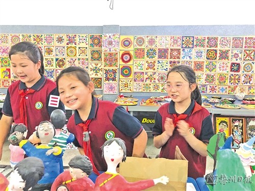 近日,作新小学举办学生书画作品展。只见整个展区五彩缤纷、绚丽夺目,而黏土区最受欢迎。瞧,用黏土捏的客家菜是那样得惟妙惟肖,捏的小动物是那样得栩栩如生,引来阵阵赞叹声。图中的孩子们好似被活灵活现的人物形象逗乐了,笑容如阳光般灿烂。(陈柳)