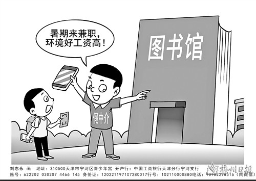 “图书馆兼职,工资日结”“220元每天,帮助整理书籍”……这样的招聘广告,是不是很诱人?当心!这很有可能是骗子设下的陷阱。近期,杭州多家图书馆发布声明,发现有人冒充图书馆名义在社交媒体平台发布招募工作人员和志愿者兼职的信息,并向报名兼职的人收取押金,提醒求职者注意辨别、提高警惕,谨防上当受骗。刘志永/图