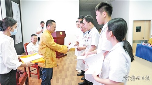 拜师仪式开始前首先进行广州中医药大学梅州医院名中医聘任仪式,聘任广州中医药大学第一附属医院肿瘤科副主任医师李佳殷教授、广州中医药大学第二附属医院(广东省中医院)重症医学科主任医师张俭教授、广州中医药大学第三附属医院普通外科副主任医师肖光辉教授为医院名中医传承工作室指导老师。