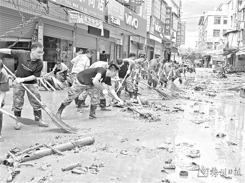与此同时,在梅县区松源镇,兴宁市人武部也集结了50余名民兵,开展清除淤泥、恢复交通、消除隐患等工作,帮助当地群众恢复正常的生产生活秩序。兴宁市人武部官兵和民兵队伍积极行动,一起拿起扫把和铁铲等工具,走上街道,分头行动,齐心协力将淤泥和垃圾清理干净。据了解,为持续打好抗洪抢险的攻坚战,兴宁市人武部已累计组织了100多名民兵执行救灾支援任务,用实际行动展现出兴宁市民兵的优良作风。