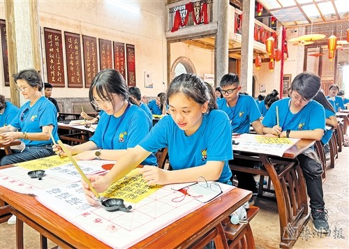 “写毛笔字,握笔很关键,请大家把笔杆握在拇指、食指和中指之间……”在南源世第这座典型的客侨民居里,印尼万隆华裔青少年们在书法老师的指导下拿起蘸满墨汁的毛笔,认真书写“福”字的各种字体,感受中国书法之美。