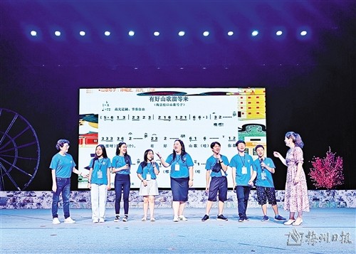 “噢嘿!(依溜呀)阿叔(个),有好山歌(哇)你都溜(哇)溜等(哪)来(哊嗨)!”6月28日,国家一级演员、省级非物质文化遗产项目(客家山歌剧)代表性省级传承人杨苑玲在山歌剧团带领着大家唱起了梅县松口山歌号子,高亢辽阔、自信圆润的歌声,让人很难想象这是营员们第一次学习客家山歌。见同学们欢欣鼓舞,山歌剧团的演员们又把杯花舞和打竹板的“绝活儿”展示了出来,营员们模仿着蹦蹦跳跳,在心中种下了中华非遗文化的种子。