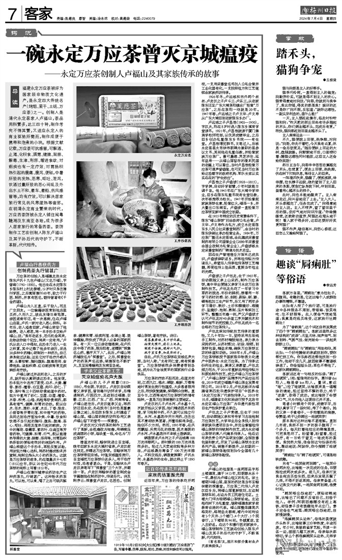 福建永定万应茶被评为国家级非物质文化遗产,是永定四大传统名产(烤烟、菜干、土纸、万应茶)之一。创制人是清代永定客家人卢福山,茶品用料繁多,达三四十种,制作考究不惮其繁,又适应永定人的商业驱驰所需而,制作成便于携带和泡煮的小块。根据文献记载,万应茶可抗感冒,可解酒、止渴、化积食、调胃、健脾、润肺、解毒、生津、利尿、增进食欲;对痢疾也有一定疗效;对胃肠积热引起的腹痛、腹泻、便秘,中暑所致的发热、恶寒、呕吐、泄泻,饮酒过量所致的恶心闷乱及外出水土不和、晕车、晕船、伤风感冒等,均有疗效,可以解决居家旅行常见的风寒湿热等诸邪。在明清永定商业繁荣的时代,万应药茶饼被永定人销往闽粤赣湘及东南亚各地,成为很多人居家旅行的常备药茶。茶饼制作工艺在创制人陈东卢福山及其子孙后代的守护下,不断革新,代代相传。