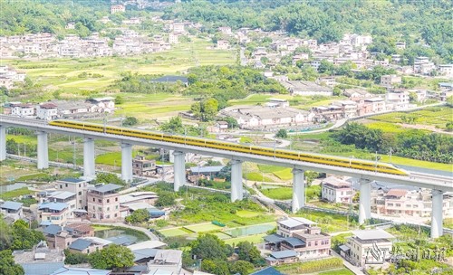本报讯 (记者郑炜梅)7月4日上午,由梅州西站开往龙川西站的一列黄色高速列车缓缓驶出梅州西站,对沿线轨道、路基、通信信号、接触网等进行实时检查。