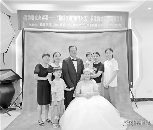 本报讯 (记者吴丽伶)7月2日至3日,梅县区程江镇大新城社区在梅县区城市党群服务中心举行“情暖夕阳 留存时光”长者婚纱公益摄影活动,为辖区内40对年龄55周岁以上的夫妇留下美好的记忆。