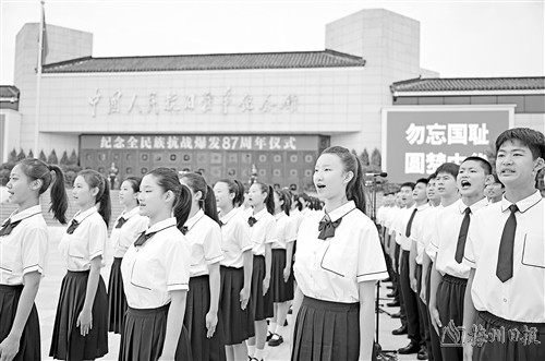 卢沟桥畔,中国人民抗日战争纪念馆巍然矗立、庄严肃穆。上午9时,纪念仪式在雄壮的国歌声中开始。首都学生代表饱含深情地朗诵了抗战诗文,首都大学生合唱团演唱了歌曲《团结就是力量》《没有共产党就没有新中国》,表达了年轻一代传承英烈精神,积极投身中国式现代化建设,立志为全面推进强国建设、民族复兴伟业贡献力量的坚定信念信心。