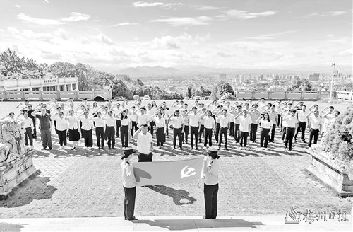 五华县直各单位97名新党员整齐列队,右手握拳,面向党旗庄严宣誓。铿锵有力的誓言在革命烈士纪念碑前回荡,坚定的眼神彰显出对党的忠诚和庄严承诺。通过集体宣誓,激励全体党员、干部进一步弘扬主旋律,加强党性锤炼,不忘先烈遗训,牢记党的宗旨,坚定政治立场,明确政治方向,净化心灵,陶冶情操,树立正确“三观”,深刻领悟“两个确立”的决定性意义,不断增强“四个意识”,坚定“四个自信”,做到“两个维护”,建立一支为民、务实、清廉的党员干部队伍。