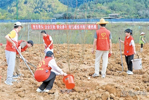 搬运苗木、打点挖坑、回填培土、提水浇灌……3月8日,梅县区组织19个乡镇、11个区直系统党委党员干部、优秀党员代表、新进党员代表等130多人在丙村镇溪联村与当地党员干部联合开展“党员先锋林”植树活动。党员干部们热情高涨,在活动中共种植苗木300多株,为梅县大地增添了一道亮丽的风景线,让党旗在乡村绿化一线高高飘扬。
