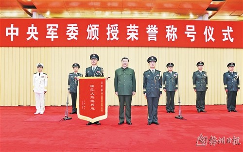 新华社北京7月9日电 在中国人民解放军建军97周年之际,中央军委9日在京隆重举行荣誉称号颁授仪式。中共中央总书记、国家主席、中央军委主席习近平向获得荣誉称号的单位颁授奖旗。