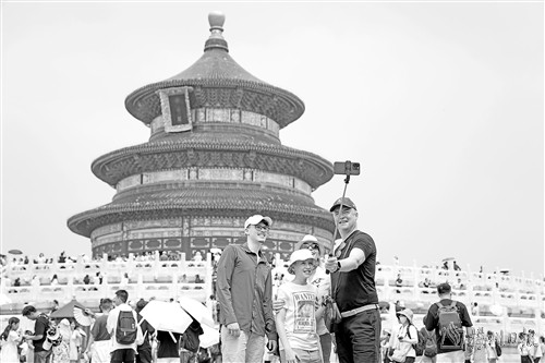 7月9日,四名来自瑞士的游客在北京天坛公园祈年殿前合影。