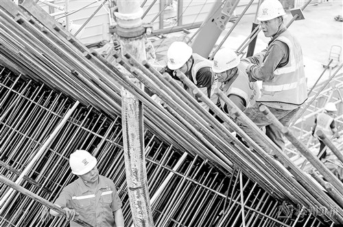 7月11日,施工人员在粤东城际铁路潮汕站至潮汕机场特大桥上跨汕昆高速公路V撑连续梁进行混凝土浇筑。