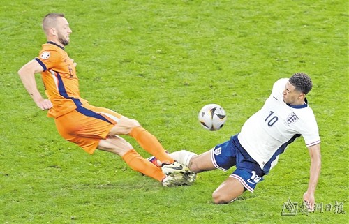图为7月10日,英格兰队球员贝林厄姆(右)与荷兰队球员德弗赖拼抢。(新华社发)