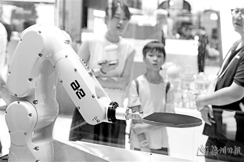 7月14日,观众在科博会上观看一款运动机器人。