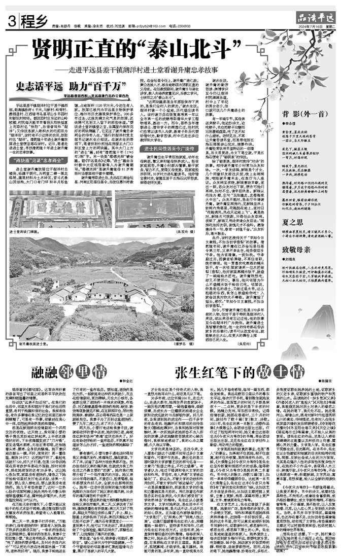 谢水生说,谢升庸的勤劳苦读、渊博学识至今仍让湖洋村民津津乐道,村中上了年纪的男女老少,信口就可说几个升庸进士的故事。