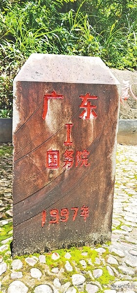 原以为,界碑会立在大山山顶,但恰恰相反,这个界碑立在一个毫不起眼的山沟密林中的山窝里,小地名叫“黄草岭”。界碑为灰白色大理石三棱柱形,界碑上面,朝着三省方向分别标有“广东”“福建”和“江西”三省省名,上方刻有“国务院1997年”字样,水泥座的界碑虽经风吹雨淋,但仍保持完好。界碑旁有一眼清泉,泉水清冽,冰冷清凉。一侧还有平远县人民政府竖立的“保护界桩 人人有责”的保护牌。环顾四周,可以发现这个界碑不仅地理位置独特,而且周围的环境也非常美丽。一边的大石头上,还刻着一行“来武平我氧你”的字样,让人印象深刻。站在界碑前,仿佛可以感受到广东、福建和江西三省的交融。这里的山水、风和日丽,又好像在诉说着一个关于友谊、合作和发展的故事。