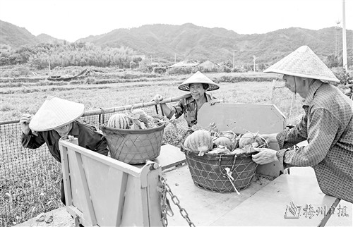 7月17日,浙江省诸暨市安华镇勾乘山村的西瓜种植户在种植基地采收西瓜,准备运往共富工坊农业产业园进行打包。
