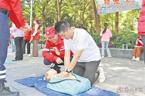活动现场,县青年志愿突击队志愿者进行了“四知、六不准”等防溺水安全知识宣讲,重点讲解落水如何自救、落水正确施救方法和溺水的急救方法,还通过互动模拟体验、情景演练参与等多种形式,结合生动的语言,手把手指导群众学习操作心肺复苏、海姆立克急救法等应急救援知识(如图),让大家在轻松的学习氛围中,把安全知识牢记于心,做到时刻保持警惕,远离危险水域。