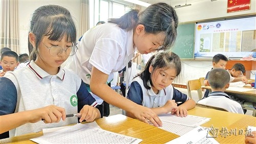 在长田镇长田学校,广州商学院“百千万工程”突击队的大学生们正在给学生们上书法课。“我们此次支教开设的主题课堂主要围绕梅州红色文化以及非遗文化,分为基础课和特色课程,基础课有书法课、音乐课、体育课、美术课、手工课。”广州商学院的吴桐同学说,他们还准备了手工漆扇、手工书签、竹编等DIY课程,丰富农村留守儿童的暑期生活。“我们主要是负责三年级、四年级小朋友支教这一块内容,我们还将结合客家文化特色,开设富有客家文化韵味的课堂。”吴桐说。