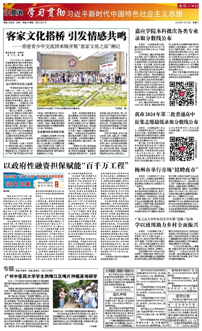 本报讯 (记者赖运香)7月23日,市教育局印发《关于公布梅州市2024年第二批普通高中征集志愿最低录取分数线的通知》,明确了19所学校征集志愿最低录取分数线,其中最低为482.7分。