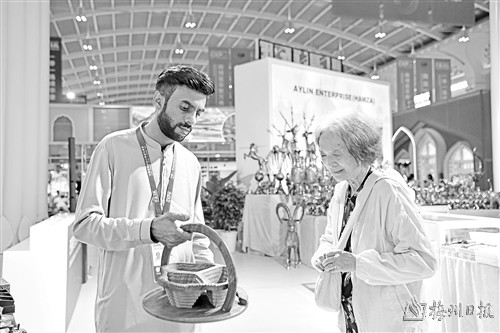 7月23日,巴基斯坦展区的展商向一名顾客推介特色商品。