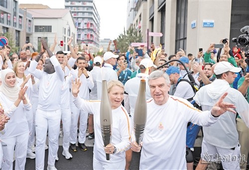 当日,2024年巴黎奥运会火炬在奥运村内传递。(新华社发)