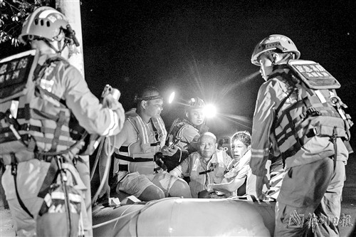 凌晨2时许,记者在决口现场看到,由于道路狭窄,通行不便,消防队员扛着救生艇向受灾区域挺进,不断有受灾群众乘坐救生艇被转移至安全地带。