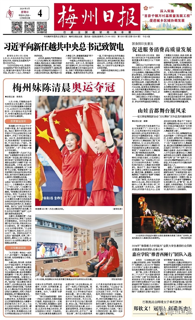 8月3日晚,巴黎奥运会羽毛球项目女双决赛中,来自梅州兴宁市的陈清晨携手搭档贾一凡,以总比分2比0的成绩击败另一对中国组合刘圣书/谭宁,夺得巴黎奥运会羽毛球项目女子双打比赛冠军。