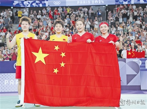 赛后,四名队员一同身披国旗绕场致意。这是“凡尘”组合的首枚奥运金牌,在东京奥运会决赛中,她们被印尼组合波莉/拉哈尤击败。
