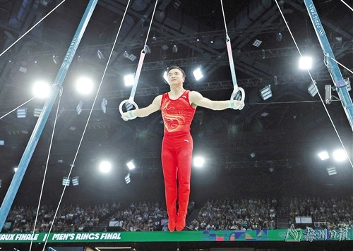 当日,在巴黎奥运会体操男子吊环决赛中,中国选手刘洋获得冠军,邹敬园获得亚军。(新华社发)