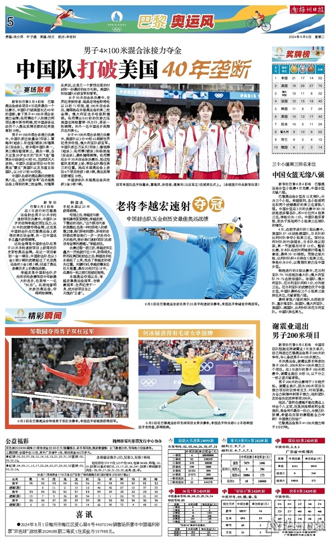 新华社巴黎8月4日电 巴黎奥运会游泳项目4日迎来最后一个比赛日,中国队打破美国长达40年的垄断,拿下男子4×100米混合泳接力金牌;张雨霏在个人和接力两项比赛中再夺两铜,把中国游泳运动员个人奥运奖牌总数的纪录提高到10枚。