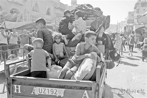 8月8日,在加沙地带南部城市汗尤尼斯东部地区,人们在以色列发出疏散警告后撤离。