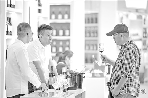 8月9日,观众在贺兰山东麓国际葡萄酒交易会现场与参展商交流、品鉴葡萄酒。
