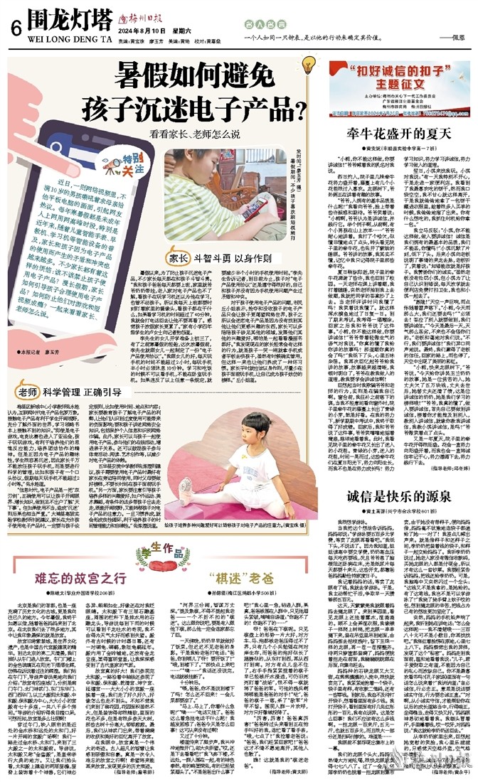 五华县安流中学教师张炼煌则建议,孩子需要使用电子产品时最好有家长在旁边陪同使用,同时父母要做好榜样,不要长时间在孩子面前玩手机。“另一方面,家长要注意引导孩子培养多样的兴趣爱好,如户外运动、美术舞蹈,有条件的话多带孩子出去走走,既能开阔视野,又能转移孩子对电子产品的注意力。一旦习惯养成,就会形成良性循环,利于培养孩子的时间管理能力和自律性。” 张炼煌说道。