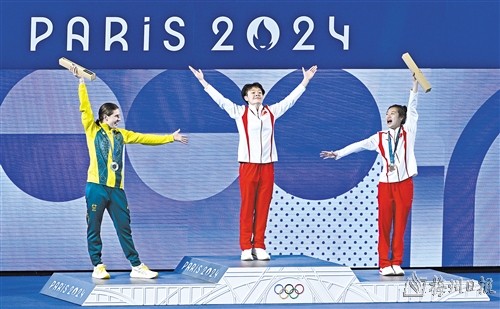 ▲女子3米板决赛 陈艺文获得金牌 昌雅妮获得铜牌 8月9日,冠军中国选手陈艺文(中)登上领奖台。 当日,在巴黎奥运会跳水项目女子3米板决赛中,中国选手陈艺文获得金牌,澳大利亚选手基尼获得银牌,中国选手昌雅妮获得铜牌。 |