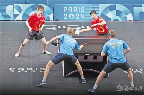 ▲乒乓球男团金牌赛 中国队夺冠 8月9日,中国队组合马龙(上右)/王楚钦(上左)和瑞典队组合科尔贝里/卡尔松(下右)在比赛中。马龙/王楚钦3比2战胜科尔贝里/卡尔松。 当日,在巴黎奥运会乒乓球男团金牌赛中,中国队战胜瑞典队,获得冠军。 (图片均为新华社发) |